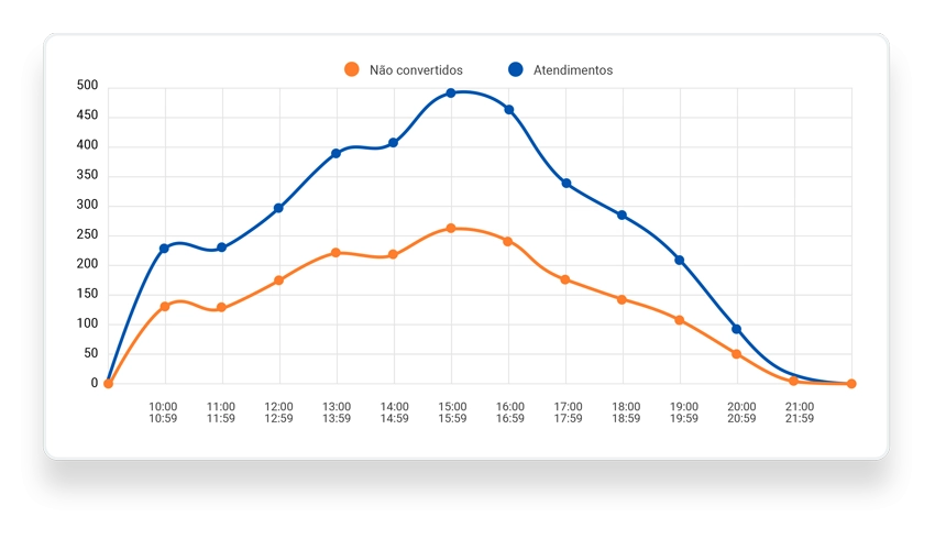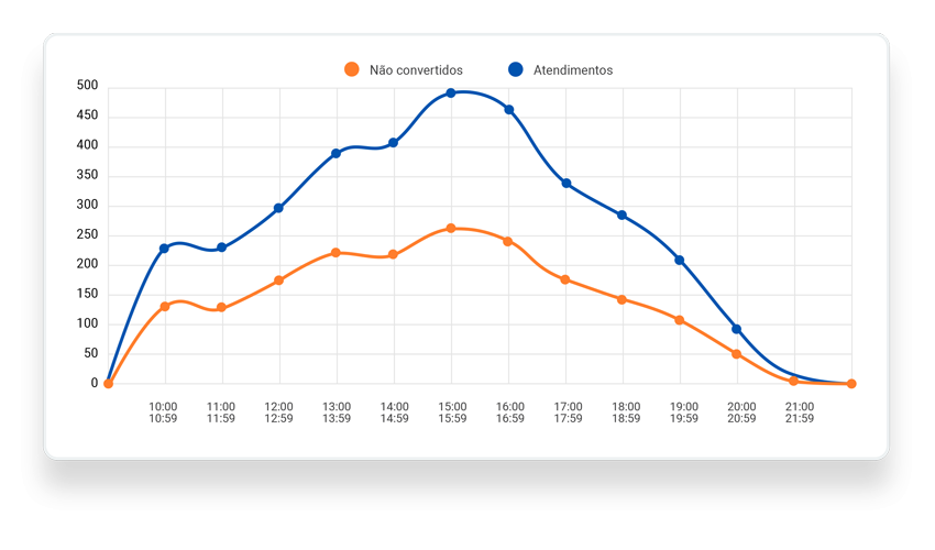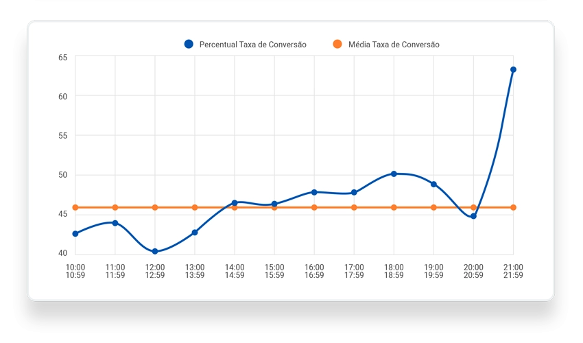 Descubra o horário de maior fluxo de atendimentos e compare com a taxa de conversão. Assim, só de bater o olho, fica fácil saber em quais horários há maior perda de venda!