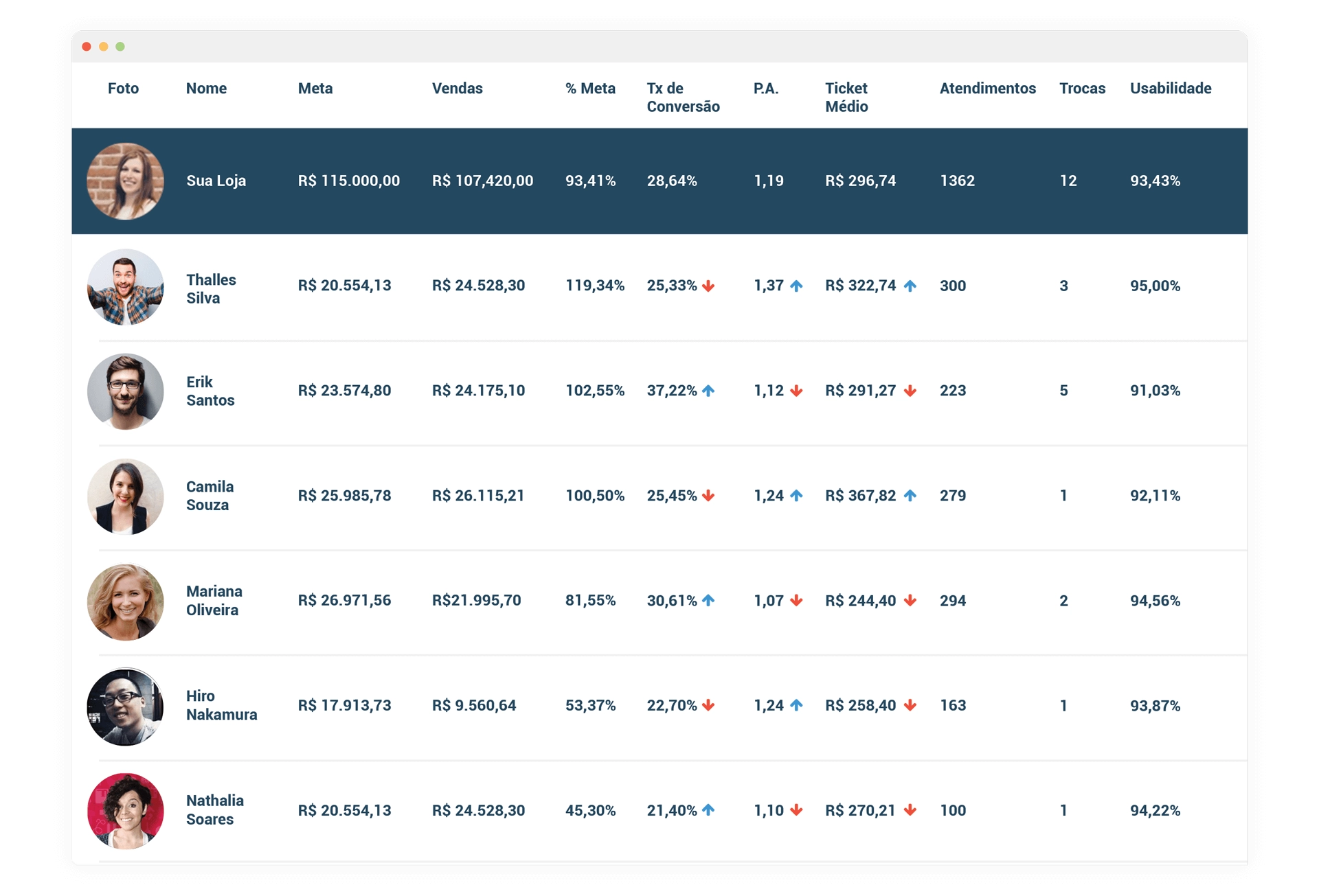 A simbologia por cores facilita a visualização da performance da sua equipe de vendas.